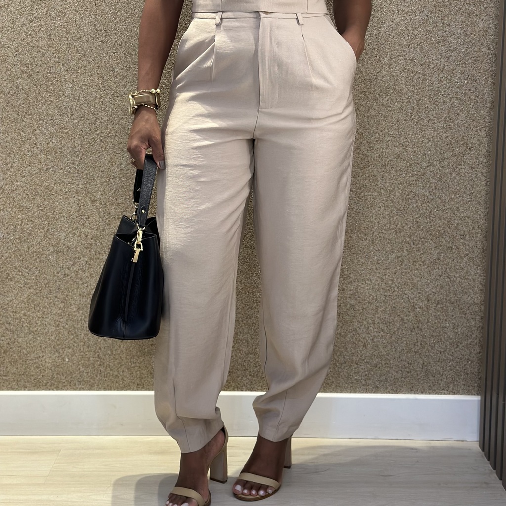 Apresentando um design elegante e contemporâneo, esta calça de alfaiataria estilo cenoura é uma peça essencial para qualquer guarda-roupa sofisticado. Com bolsos laterais discretos e um bolso falso na parte de trás, esta calça combina funcionalidade e estilo. Sua elegante prega frontal adiciona um toque de refinamento, enquanto os passantes de cinto permitem personalização adicional.