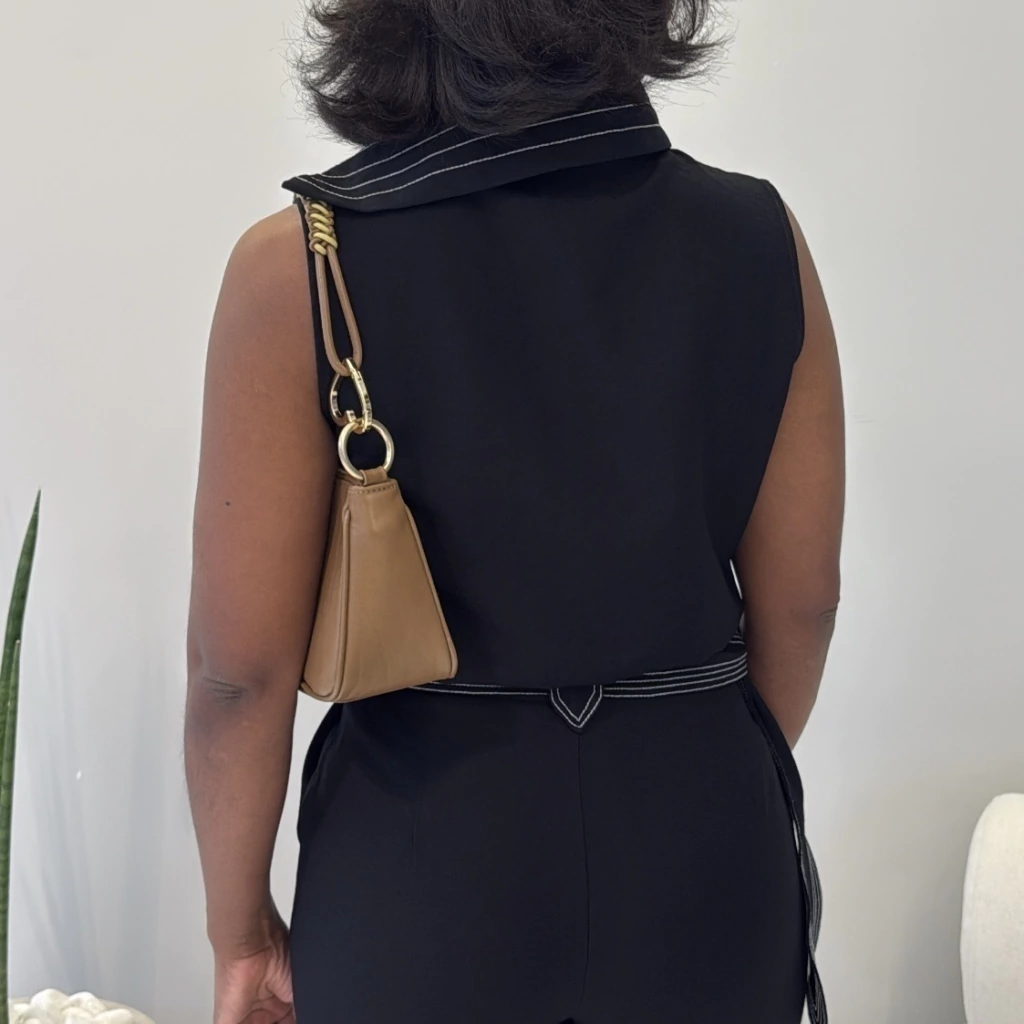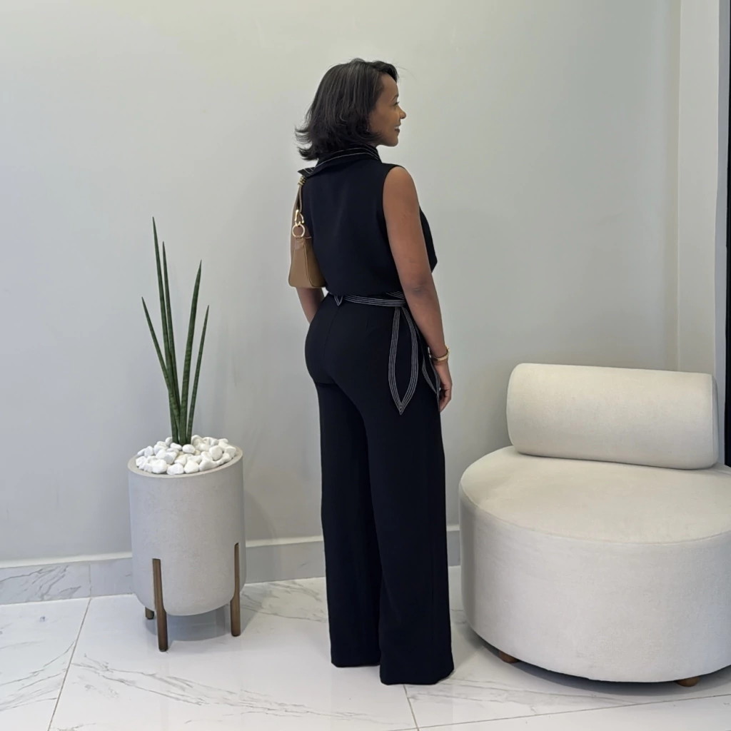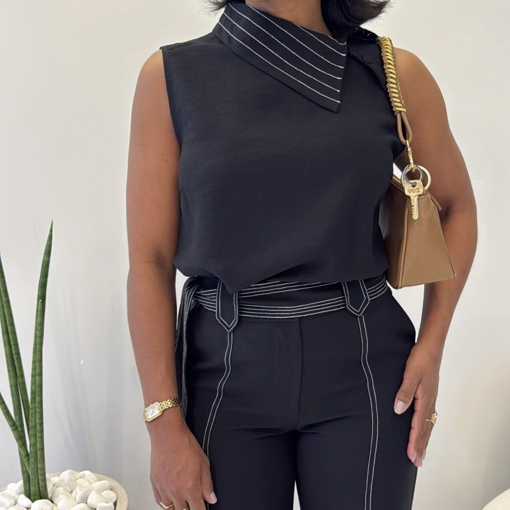 Este look é a definição perfeita de sofisticação minimalista e versatilidade. A blusa sem mangas com gola estruturada traz um toque moderno e refinado, enquanto a calça de alfaiataria com cintura alta e cinto acompanha as curvas com elegância. O acabamento impecável em costura aparente valoriza ainda mais a peça — ideal para quem ama detalhes com personalidade.