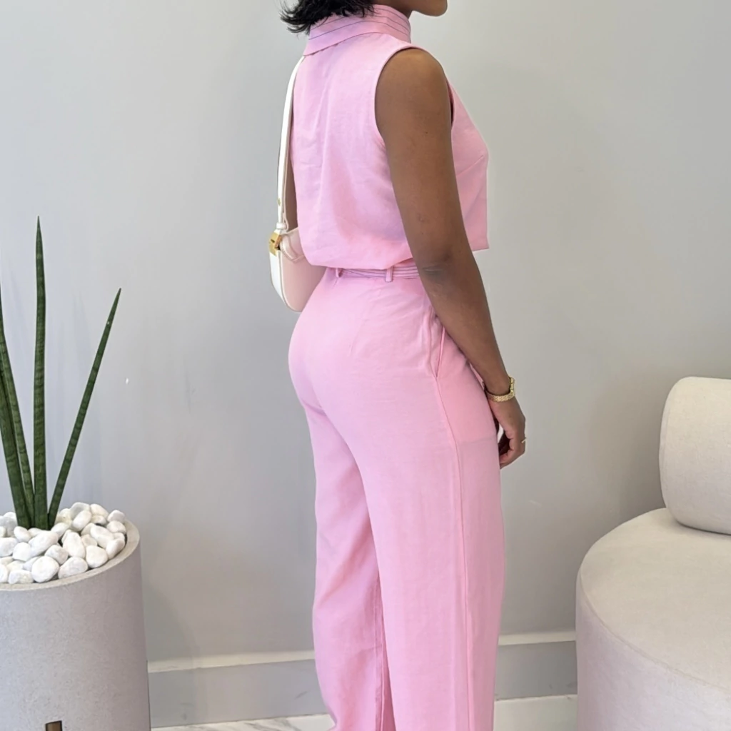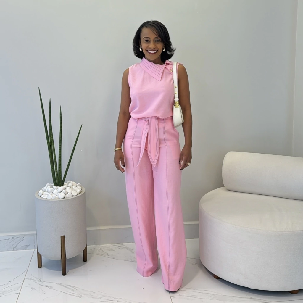 Este look é a definição perfeita de sofisticação minimalista e versatilidade. A blusa sem mangas com gola estruturada traz um toque moderno e refinado, enquanto a calça de alfaiataria com cintura alta e cinto acompanha as curvas com elegância. O acabamento impecável em costura aparente valoriza ainda mais a peça — ideal para quem ama detalhes com personalidade.