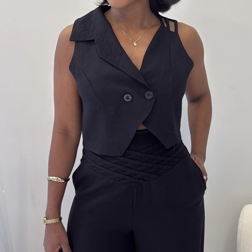 ✨ O colete estruturado com botões duplos valoriza a silhueta e imprime autoridade com charme.