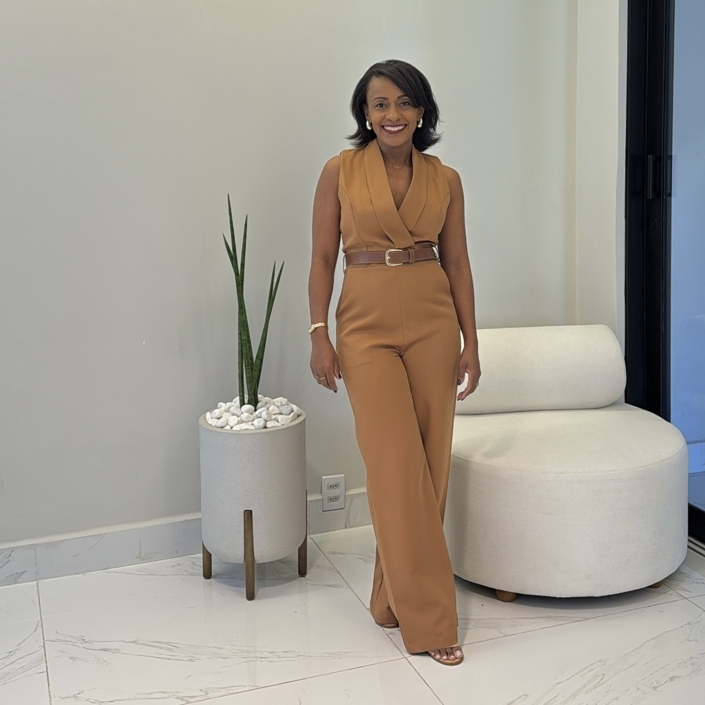 Macacão na cor café com corte impecável e cinto que valoriza a silhueta. Perfeito para quem quer marcar presença com sofisticação e estilo.