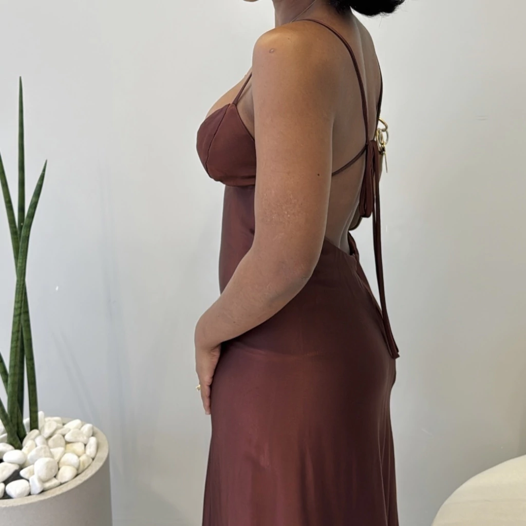 Confeccionado em tecido acetinado, proporciona um brilho sutil e toque macio, elevando qualquer produção. O decote frontal valoriza o colo com elegância, enquanto as garantem um toque sensual na medida certa.costas abertas com amarração